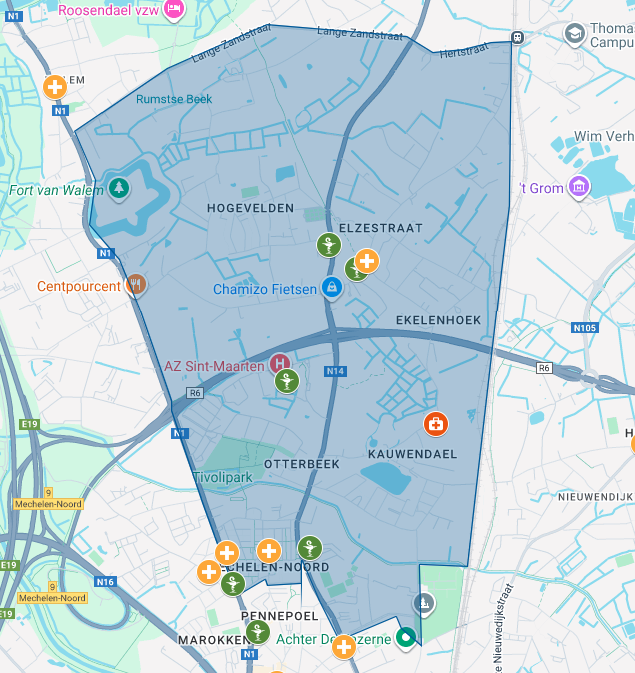 Om onze zorgkwaliteit te blijven garanderen, geven wij voorrang aan ons bestaande patiëntenbestand. Daarom kunnen enkel nieuwe patiënten die in het afgebakende gebied op onderstaande kaart wonen én momenteel geen huisarts hebben in de regio Mechelen of Sint-Katelijne-Waver (bijvoorbeeld door verhuis of pensionering van hun huisarts) nog inschrijven in onze praktijk.